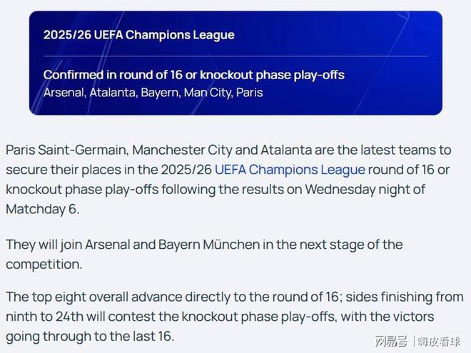 欧足联官网确认,5支球队已经锁定附加赛资格(前24名),包括榜首18分的阿森纳,15分的拜仁慕尼黑,以及巴黎圣日耳曼、曼城和亚特兰大,三支同积15分的球队。其中英超2队,德甲、法甲和意甲各1队,五大联赛独缺西甲。